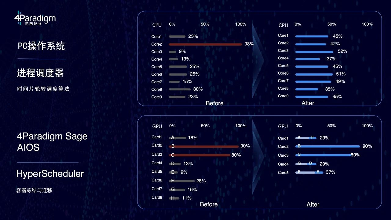 PC时代早期,因应用程序无响应、突然闪退而导致的机器资源损耗及时间浪费屡见不鲜。这是因为PC缺乏好的资源调度管理,所有任务都只能在一个“核”上排队,Windows通过“进程调度器”解决了这一问题。AI在落地过程中面临着同样的问题,Sage AIOS通过自主研发的HyperScheduler 担当“进程调度器”的作用,基于容器冻结与迁移技术,可根据任务与资源的情况动态调度,并可对中断任务内容进行恢复,可将资源利用率提升50%,AI全流程耗时节约三分之二。
